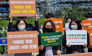 아이쿱소비자생활협동조합연합회원들이 11일 오전 서울 여의도 국회 앞에서 '식품에 암 예방을 위한 정보표기'를 요구하는 성명과 함께 200만 서명운동 기자회견을 하고 있다.