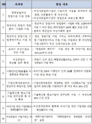 경력단절여성의 창업 지원을 위해 '여성새로일하기센터' 프로그램 이수자가 창업자금(융자)을 신청할 경우 가점이 부여되고 여성(예비)창업자 100명에게 창업준비·사업화 바우처 최대 100억원이 지원된다. 또한 청년여성 취업활성화를 위해 '기업인력애로센터'에서 실시하는 대기업의 인프라를 활용한 교육-취업 연계 프로그램에 최소 30% 이상 청년여성을 선발토록하고 '기술혁신형 중소기업'에 고급 연구인력 인건비 지원 시 여성이 30% 이상 선정되도록 연구인력 선발 과정에서 여성에게 가점을 부여한다.