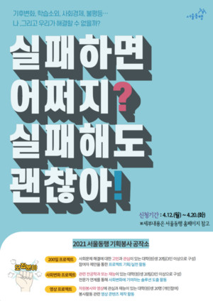 서울시자원봉사센터는 '2021 서울동행 기획봉사 공작소' 참여자를 20일까지 집중 모집한다.서울동행 기획봉사 공작소는 대학(원)생들이 평소 관심을 가지고 있던, 기후변화, 학습소외, 사회경제, 불평등 등의 다양한 사회문제를 찾고, 해결을 위한 봉사활동을 기획하여 실천하는 프로그램이다.약 6개월간 진행되는 기획봉사 공작소는 프로젝트별 200일, 사회변화, 영상제작 등의 주제로 진행되며, 참가자들은 관심과 역량에 맞는 프로젝트에 신청한 뒤, 선정되면 소정의 활동운영비를 지원받아 본인의 기획을 실현해 나갈 수 있다.기획봉사 공작소에서는