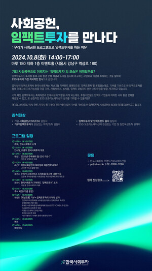 공익법인 한국사회투자가 내달 8일 '사회공헌, 임팩트투자를 만나다'를 주제로 세미나를 개최한다고 밝혔다.한국사회투자는 기업 사회공헌으로 이뤄지는 임팩트투자의 의미와 성과를 조명하기 위해 대기업, 스타트업, 학계, 언론 등 각 분야 전문가가 함께하는 세미나를 기획했다.이번 세미나는 내달 8일 마루 180(강남구 소재)에서 진행되며 참석 대상은 ▲기업 사회공헌/CSR/ESG 담당자 ▲기부/임팩트투자에 관심있는 학계/조직 담당자 ▲임팩트투자 및 임팩트펀드 출자 담당자 ▲ESG 오픈이노베이션에 관심있는 기업 및 창업육성조직 관계자 등이다.
