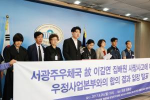 서광주우체국 故이길연 집배원 유가족과 대책위는 25일 오전 10시 서울 여의도 국회 정론관에서 우정사업본부와의 합의 결과에 대한 입장을 발표했다.고인의 장남 유가족 대표 이동하 씨는 “아버지는 자살이 아니라 사회적 타살로 돌아가시게 됐다. 업무상 교통사고를 당했음에도 공상처리 되지 못하고 일반병가로 쉴 수밖에 없고 반복된 출근종용에 극단적 선택을 하신 것”이라고 말했다. 이 씨는 “22일 세종시 우정사업본부에 항의방문 전날까지 유가족이 원하는 자료는 줄 수 없다고 으름장을 놓았고, 부패된 아버지의 시신을 들쳐 업고 서울로 가겠다고