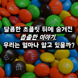 달콤한 초콜릿 뒤에 숨겨진 씁쓸한 이야기, 우리는 얼마나 알고 있을까?초콜릿의 세계 최대 생산국은 코트디아르(41%), 가나(18%), 인도네시아(14%), 나이지리아 (6%) 순이다. 카카오 농장 대다수의 노동자는 아동으로 일억육천팔백만명의 아이들이 학교가 아닌 농장에서 노동을 한다. 슈퍼에서 1000원 내고 사 먹는 초콜릿, 카카오 재배하는 농부들에게 돌아가는 수익은 단 70원이다.이를 해결하기 위해 등장한 공정무역은 "소외된 생산자와 노동자들에게 더 나은 거래 조건을 제공하고 그들의 권리를 보호함으로써 지속가능한 발전에 기여