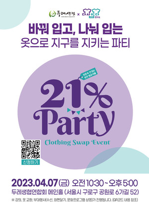 두레생협연합회(이하 연합회)는 자원순환으로 환경을 파괴하는 패션산업의 문제를 조명하고, 쉽게 버려지는 옷들을 나눔으로 기후위기 시대에 새로운 옷장 문화를 만들기 위해 '바꿔입고, 나눠 입는 옷으로 지구를 지키는 파티'를 개최한다. 연합회는 "옷장 속, 사놓고 입지 않는 옷들의 평균 비율은 21%, 이젠 우리 서로 바꿔 입어요. 옷장은 터질 것 같은데 막상 입을 옷이 없다며 오늘도 쇼핑 앱을 켜지는 않았나요?"라며 행사 취지를 강하게 전달했다. 지구를 지키는 파티는 4월 7일 오전 10시 반부터 오후 5시까지 진행되며, 사전 행사로