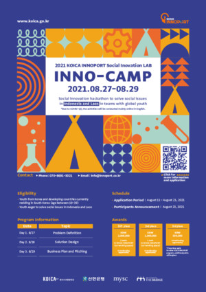 한국국제협력단(KOICA, 이하 코이카)가 주최하고 신한은행이 후원하며, 사단법인 더 브릿지가 주관하는 인도네시아 및 라오스의 사회 문제 해결 해커톤 INNO-Camp(이하 이노캠프)가 8월 27일(금)~29일(일) 3일간 온라인으로 진행됐다.이노캠프는 코이카 이노포트(KOICA INNOPORT)의 프로그램 가운데 하나로, 국내외 청년들이 개발도상국의 지속가능발전목표(Sustainable Development Goals, 이하 SDGs)와 관련된 이슈를 발굴하고, 한국에 유학하고 있는 개도국 청년들이 현지 전문가(이하 INNO 파트