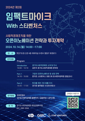 경기도사회적경제원이 임팩트투자 기반 조성을 위해 오는 14일 경기도 옛청사에서 '제2회 임팩트마이크:오픈이노베이션 전략과 투자계약' 특강을 열기로 하고 13일까지 참가자를 모집한다. '임팩트투자'란 재무적 수익 창출과 함께 사회문제 해결을 고려하는 투자를 말한다. 이번 교육은 ▲오픈이노베이션 및 성장전략(스타벤처스 문지은 대표) ▲투자를 위한 기초 법률 지식(권기준 법무법인 수오재 변호사) 등의 강의로 구성됐다. 사회적경제조직에 관심 있는 누구나 무료로 수강할 수 있으며 경기도사회적경제원 누리집 또는 특강 포스터 내 큐알 코드를 통
