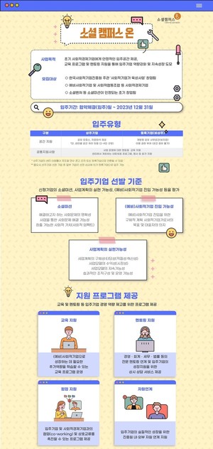 한국사회적기업진흥원(이하 진흥원)은 다양하고 혁신적인 사회적기업을 육성하는 사회적기업 성장지원센터 '소셜캠퍼스 온'을 운영하고 있다. 초기 사회적경제기업에 안정적인 입주 공간을 제공하고 교육과 멘토링 지원으로 성장을 지원하기 위해, 2023년 전국 센터에 새롭게 입주할 기업을 모집한다. 대상은 진흥원이 주관하는 '사회적기업가 육성사업' 창업팀으로 최근 3년 이내 육성사업을 수료한 창업팀을 우대한다. 또한 예비사회적기업 및 사회적협동조합 등 사회적경제기업이어야 하며, 소셜벤처의 경우는 정부‧지자체‧중간 지원 기관의 사회적경제 창업지원