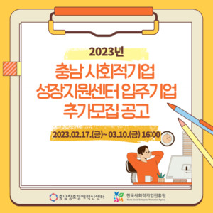 충남창조경제혁신센터는 충남 소재 (예비)사회적기업을 대상으로 '소셜캠퍼스 온 충남'에 입주할 입주기업을 추가모집한다.'소셜캠퍼스 온'은 고용노동부 산하기관 산국사회적기업진흥원에서 운영하는 사회적기업 성장지원센터로 복권기금으로 조성됐다.소셜캠퍼스 온 충남은 충남도내 초기 (예비)사회적경제기업에게 안정적인 입주공간을 제공하고, 교육 프로그램 및 멘토링 지원을 통해 입주기업의 역량을 강화하고 지속 성장을 도모하기 위한 사업이다. 충남창조경제혁신센터가 한국사회적기업진흥원으로부터 사업을 위탁받아 2023년부터 운영중이다.상주기업 및 등록기업