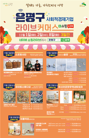 서울시 은평구가 사회적경제 기업 판로지원을 위해 네이버 쇼핑라이브에서 '사회적경제 기업 라이브커머스'를 진행한다고 밝혔다.사회적경제 기업 라이브커머스는 실시간 온라인 방송으로 사회적경제 기업을 홍보하고, 우수 제품을 시중보다 저렴하게 판매한다. 댓글 구매인증, 퀴즈 등 다양한 이벤트도 진행한다.라이브커머스는 내달 1, 2, 8일 3회에 걸쳐 진행하며, 사회적경제 기업 5곳이 참가한다. 행사 당일 '네이버 쇼핑라이브' 누리집에 접속해 은평구를 검색해 참여하면 된다.첫 방송은 11월 1일로 '스프링샤인', '협동조합쓸모&모어엠'이 참여