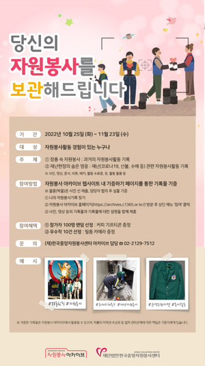 한국중앙자원봉사센터가 '자원봉사 아카이브 기록수집 이벤트'를 개최한다.'자원봉사 아카이브 기록수집 이벤트'는 자원봉사 활동 경험이 있는 사람이라면 누구나 참여할 수 있으며, 자원봉사 현장의 다양한 기록물을 모아 공공의 유산으로 보존·활용하기 위해 마련됐다.자원봉사 아카이브 기록수집 이벤트는 과거 자원봉사 기록물을 수집하는 '장롱 속 자원봉사'와 재난현장에서의 기록물을 수집하는 '재난현장의 숨은 영웅', 이상의 두 가지 주제로 진행된다. 주제별로 참여자 50명씩 총 100명을 추첨해 커피 기프티콘을 증정하며, 우수작 10건에 대해서는