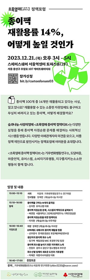 종이팩 100개 중 14개만 재활용되고 있다는 사실, 알고 있나요? 재활용할 수 있는 소중한 자원임에도 불구하고 무심히 버려지고 있는 종이팩, 어떻게 해결할까요? 재단법인 숲과나눔과 사회복지공동모금회 사랑의열매는 종이팩 자원순환 문제를 해결하기 위해 '초록열매 종이팩 컬렉티브' 프로젝트를 진행하고 있다. 사업의 일환으로 오는 21일 정책포럼을 개최한다.종이팩은 음료를 담아 보관하기 위한 종이 재질의 용기이다. 고급 천연펄프로 만들어져 화장지, 페이퍼타올 등으로 재활용할 수 있다.