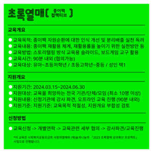 (재)숲과나눔은 사회복지공동모금회 사랑의열매와 함께 진행하는 '2024 초록열매 성과확산 프로젝트' 사업수행단체를 모집한다.숲과나눔과 사랑의열매는 지난 2021년부터 환경문제를 해결하는 창의적인 시민 활동을 발굴·지원하는 '초록열매'를 진행하며, 자원순환 분야에 대한 시민들의 높은 관심과 역량을 확인했다. 이를 바탕으로 실질적인 문제 해결과 사회적 임팩트 창출을 위해 2023년 가을, 자원순환 모델 개발 및 정책화 사업 '초록열매 성과확산 프로젝트'를 시작했다.1차년에는 재활용률 14%에 불과한 종이팩 자원순환 문제를 해결하기 위한