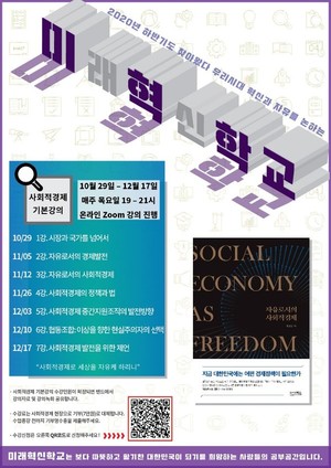 미래혁신학교에서 2020년도 하반기 사회적경제 기본 강의를 오는 29일부터 진행한다.총 7주차 프로그램으로 운영되는 이번 강의는 강의를 운영하는 김종걸 한양대학교 국제대학원장의 저서 ‘자유로서의 사회적경제’를 교재로 하여 진행된다. ‘자유로서의 사회적경제’는 경제 발전의 목적이 GDP의 증대가 아니라 사회구성원들의 경제적·사회적·정치적 삶을 한 차원 높이는 것이며, 따라서 시민들의 자발성과 자기책임이 결합된 '사람 중심 경제'를 만들어 나가야 함을 강조하는 한편 사회적경제조직이 어떻게 자신의 탁월성을 증명하고, 시장경쟁에서 성과를