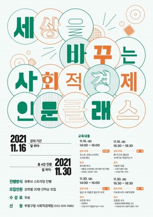 인천광역시 부평구가 오는 25일부터 '세상을 바꾸는 사회적경제 인문클래스'의 수강생을 모집한다.'세상을 바꾸는 사회적경제 인문클래스'는 ‘사회적경제’ 개념이 생소한 구민을 대상으로 사회적경제의 중요성과 필요성을 이해시키고 공감대를 형성하기 위해 진행하는 인문학 강좌다.이번 클래스는 ▲1회 '트렌드' 교육: 포스트 코로나 시대의 소비 트렌드, 강사: 최지혜 박사('트렌드코리아' 저자) ▲2회 '환경' 교육: 왜 지구의 절반은 쓰레기로 뒤덮이는가, 강사: 이동학 대표('쓰레기책' 저자) ▲3회 '인권' 교육: 일상 속 차별과 혐오의 씨