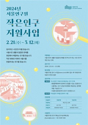 2023년 청년 창업가가 성수동에 느끼는 매력 연구, '응팔(tvN 드라마 '응답하라 1988')'로 본 서울 인구구조 변화 대응방안, 서울 대학 내 폐기물 분리배출 개선방안 등 시민 삶과 맞닿아 있는 다양한 주제를 발굴해 의미 있는 연구 결과를 도출해 냈던 서울연구원 '작은연구 지원사업'이 올해도 진행된다.서울연구원은 2월 21일부터 3월 12일까지 '2024년도 작은연구 지원사업'을 공모한다고 밝혔다.시민 누구나(개인 또는 단체) 참여할 수 있으며 서울연구원 누리집을 통해 원하는 주제 유형(기획·자유주제)을 선택해 제출하면 된다