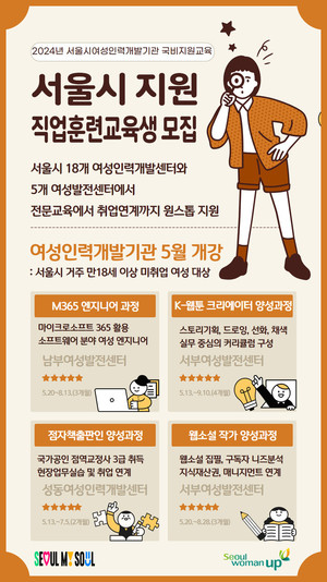 서울특별시여성능력개발원은 서울시 미취업여성의 미래유망직종 입직을 지원하기 위해 서울시여성인력개발기관 직업교육과정 훈련생을 모집한다고 22일 밝혔다.5월 개강하는 과정은 ▲M365 엔지니어 과정 ▲K-웹툰 크리에이터 양성과정 ▲웹소설 작가 양성과정 ▲점자책출판인 양성과정 등이다.'M365 엔지니어 과정'은 'Microsoft 365'를 활용해 업무용 소프트웨어를 설치, 관리할 수 있는 엔지니어를 양성하는 취업연계형 과정으로 소프트웨어산업 분야 여성 엔지니어로 진입할 수 있도록 체계적인 지원을 받을 수 있다. 교육은 남부여성발전센터(금