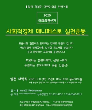 “사회적경제에 투표합시다” 민주당·정의당·녹색당 사회적경제 활성화 약속21대 국회의원 선거가 본격적인 궤도에 올랐다. 중앙선거관리위원회에 따르면 4.15총선 후보자 등록 마지막 날인 지난 3월 27일까지 전국 253개 지역구에 1,118명이 등록했고, 경쟁률은 평균 4.4대 1을 기록했다. 하지만, 코로나19 여파로 대면접촉이 사라지다보니 유권자가 후보자를 검증할 여건이 부족해지고 후보자들이 내세우는 정책들은 무엇인지 알지 못하는 상태로 깜깜이 선거를 치러질 수 있다는 우려가 높은 상황이다.한국사회적경제연대회의(이하 연대회의)는 정