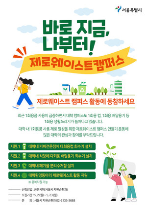 서울시가 '제로캠퍼스'에 참여할 25개 대학교를 모집한다. '제로캠퍼스'는 서울시의 폐기물 감량 정책인 '제로웨이스트 서울 프로젝트' 사업을 캠퍼스에 적용한 것으로, 비대면 소비 확산으로 증가한 일회용품 폐기물 문제를 해결하기 위해 대학과 학생이 주도해 캠퍼스 내 폐기물 감량에 나서는 프로젝트다.서울시는 '제로웨이스트 서울 프로젝트' 사업을 활용해 '제로카페', '제로식당'을 선보인 바 있다. 시는 '제로카페'로 대학가나 사무실 밀집 지역 등에 선정한 16개 거점에서 카페·프렌차이즈와 협력해 매장 내 다회용 컵 무인회수기를 보급했고