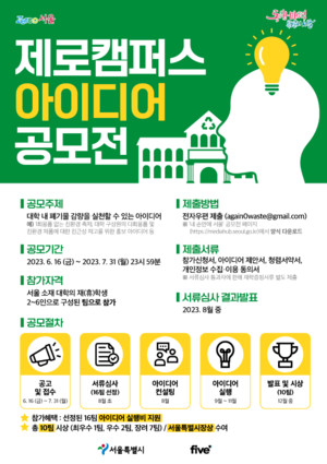 서울시는 대학 내 자발적인 폐기물 감량 문화를 조성하기 위해 '제로캠퍼스 아이디어 공모전'을 개최한다.'제로캠퍼스'란 1회용품 없는 캠퍼스를 의미하며, '제로캠퍼스 아이디어 공모전'은 대학 내 1회용품 사용 및 폐기물 감량을 실천하기 위한 참신한 아이디어와 실행력을 가진 서울 소재 대학생(재·휴학생)을 대상으로 한다. 2~6인으로 구성된 팀 단위로 참여할 수 있다. 공모전 접수는 6월 16일부터 7월 31일 까지며, 누리집 '내손안에서울' 내 공모전 페이지에서 양식을 내려받고 작성 후 전자우편으로 제출하면 된다. 시는 8월 중 서류