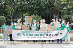 (사)소비자기후행동(이하 소비자기후행동)과 아이쿱소비자생활협동조합(이하 아이쿱생협) 13개 조합은 4일 환경부가 있는 정부세종청사 앞에서 종이팩 재활용 체계 마련을 촉구하는 기자회견을 열었다. 이들은 환경부는 하반기부터 종이팩 분리배출 시범사업의 전국 확대를 언급했으나 시행되지 않고 있다며 환경부에 ▲종이팩 재활용률을 높이기 위한 체계 마련 ▲종이팩 분리배출함 설치 확대 약속 이행 ▲지자체 종이팩 적극 수거를 위한 시행 지침 마련의 조속한 시행을 촉구했다. 작년 12월, 환경부는 종이팩 분리배출 시범사업 운영에 나섰다. 남양주시,