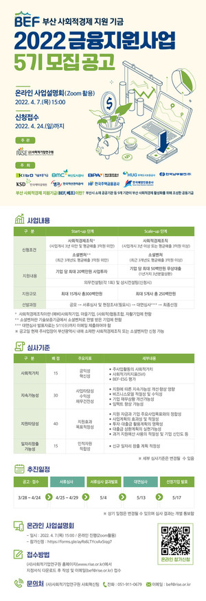 부산광역시 소재 9개 기관이 부산지역 사회적경제 활성화를 위해 2018년 조성한 '부산 사회적경제 지원 기금(BEF)'에서는 다양한 사회문제를 해결하는 사회적경제기업을 포함한 사회목적기업을 지원하기 위해 2022년도 5기 금융지원사업 참여기업을 모집한다. ※ 부산 사회적경제 지원기금 베프(BEF)란?기술보증기금, 부산도시공사, 부산항만공사, 주택도시보증공사, 한국남부발전㈜, 한국예탁결제원, 한국자산관리공사, 한국주택금융공사, 한국해양진흥공사 총 9개 기관이 부산지역 내 일자리 창출 및 지역경제 활성화에 기여하는 사회적경제 활성화를