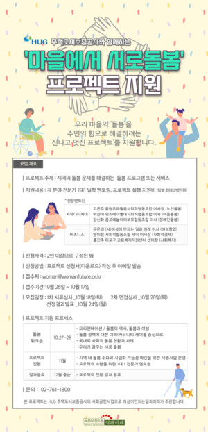 HUG 주택도시보증공사와 사단법인 여성이 만드는 일과 미래가 함께 주민의 힘으로 마을 돌봄을 해결할 수 있도록 지원한다.'마을에서 서로돌봄' 프로젝트는 지역의 돌봄 문제를 해결하는 프로그램이나 돌봄 서비스를 진행하려는 팀에 그 분야의 전문가를 1대 1로 매칭하여 밀착 멘토링을 지원한다. 멘토진은 커뮤니티케어의 ▲노인 돌봄 ▲아동 돌봄 ▲장애인 돌봄과 비즈니스 분야의 ▲여성 창업 ▲사회적경제 ▲사회복지 영역의 전문가로 구성되어 있다. 또한 팀별 최대 2백만 원의 실행 지원비도 제공한다. 지원 자격은 2인 이상으로 구성된 팀으로, 여성