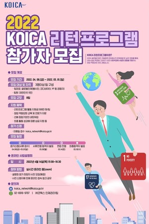 한국국제협력단(KOICA)은 국내·외 사회문제 해결 및 사회적 가치 실현에 기여하는 혁신적인 창업 아이디어를 발굴하고, 사업화를 지원하는 '2022년 KOICA 리턴프로그램'에 참여할 창업팀을 모집한다. 리턴프로그램은 사회적경제와 개발협력 현장의 지속가능개발목표(SDGs) 달성에 도움을 주는 연계형 창업 아이디어를 발굴하고, 사회적경제 기업 창업을 지원한다. 창업팀으로 선정되면 아이디어 검증을 위한 사업비를 팀당 최대 500만 원씩 교부하고, 자문위원과 교육 및 네트워킹 등 역량 강화를 위한 다양한 지원을 받을 수 있다. 참가자격은