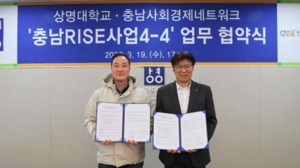 (사)충남사회경제네트워크와 상명대학교가 지역혁신중심 대학지원체계(RISE) 활성화와 지역문제 해결을 위한 업무협약을 19일 체결했다. 이번 업무협약은 양 기관의 상호유대를 강화하고 지역에 필요한 사업을 위한 유기적 협력 및 교류 활성화를 도모하고자 마련됐다. 양 기관은 청년 로컬활동 생태계 조성 및 로컬 혁신인재 양성을 중심 사업으로 삼고 ▲지역혁신중심지원체계 구축 및 실행을 위한 인적·물적 교류 ▲ 지역 인재양성을 위한 맞춤형 교육 프로그램 기획 및 운영 ▲ 지역사회공헌 관련 사업 개발 및 운영 등에 협력하기로 하였다. 안범준 상