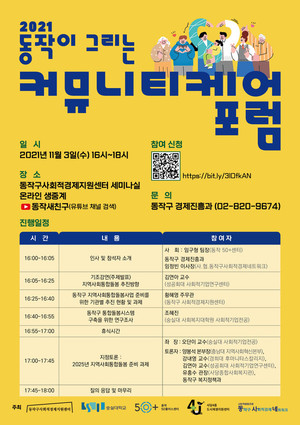 동작구가 '동작이 그리는 커뮤니티케어'를 주제로 포럼을 11월 3일 복지원센터 세미나실에서 진행한다.이번 포럼은 동작구 내 돌봄사업을 진행하고 있는 유관기관(사당4동 도시지생지원센터⋅동네한바퀴 사회적협동조합, 사회적협동조합 동작구사회적경제네트워크, 동작 50+센터)과 동작구청 복지정책과(서울시 돌봄 SOS사업진행), 숭실대 사회복지대학원 등 지역사회 민관학이 함께 2021년 추진된 돌봄사업 현황을 공유하고 고민을 나누는 자리로 마련됐다. '지역사회 통합돌봄'이란 돌봄이 필요한 어르신이나 장애인이 자신의 거주 지역에서 개개인이 원하는