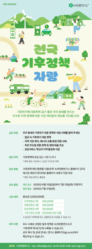 녹색전환연구소가 지역 곳곳에서 묵묵히 변화를 이끌어온 작지만 강한 기후정책을 발굴하는 '전국기후정책자랑' 공모전을 개최한다고 16일 밝혔다.이번 공모전은 살기 좋은 동네와 지역을 만든 우수한 기후정책 및 사업 사례를 발굴하는 것이 목적이다. 광역·기초 지방정부는 물론, 마을과 주민공동체 단위에서 추진된 정책 경험과 효과 그리고 개선 아이디어까지 두루 접수받는다.폭염과 한파 속에서 지역주민을 돌보는 주민센터, 마을 단위 에너지자립 사례, 무상대중교통으로 시민들의 이동을 돕고 탄소배출을 도운 정책 등 복지·에너지·교통·먹거리·건강 등