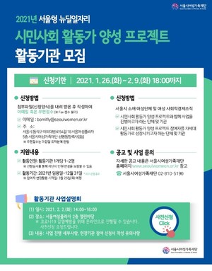 서울시여성가족재단은 청년여성 및 경력보유여성에게 여성 활동가로서 일 경험을 제공하는 '시민사회 활동가 양성 프로젝트'를 실시하고, 일자리를 제공할 서울시 소재 여성단체 및 여성사회적경제조직을 모집한다.
