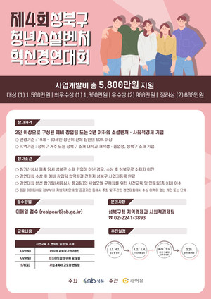 서울특별시 성북구가 지역사회 문제를 창의적이고 혁신적인 방법으로 해결할 청년 사회적기업가를 모집한다. '2023년 성북구 청년 소셜벤처 혁신 경연대회'는 사회변화를 꿈꾸는 청년들이 참신하고 역량 있는 아이디어를 공모하여 사회문제 해결 비즈니스 모델을 발굴하고, 청년 창업을 지원함으로써 사회적경제 활성화에 기여하는 사업이다.참가자격은 2인 이상으로 구성된 예비창업팀 또는 설립 2년 미만의 소셜벤처 및 사회적경제 기업으로, 만 19~39세 청년이 전체 팀원의 50% 이상이어야 하며 성북구 거주인 또는 성북구 소재 대학교 재학생·졸업생,