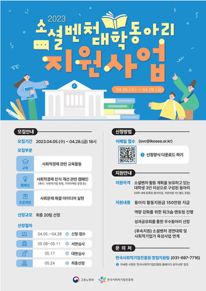 소셜벤처 관련 아이디어를 보유한 대학생들의 참여를 통해 창업문화 확산 및 사회적경제에 대한 이해도를 높이기 위해 한국사회적기업진흥원(이하 진흥원)에서는 '2023 소셜벤처 동아리 지원 사업' 참가팀을 모집한다. 사회문제에 관심을 가지고, 이를 해결하기 위한 아이디어 및 소셜벤처 관련 사업 아이디어로 활동하거나 계획 중인 중앙 및 단과대학 학부 동아리에서 참여할 수 있다. 동아리는 대학생 3인 이상으로 구성되어야 하며, 별도로 자문위원 1인이 함께해야 한다. 선발을 통해 최종 20팀을 모집하며, 진흥원은 사업 기간 동안 성실하고 꾸준