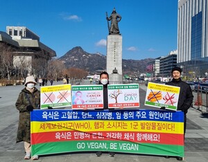 '세계 암의 날(World Cancer Day)'을 맞아 한국채식연합·한국비건연대·비건세상을위한시민모임이 4일 오후 1시 서울 광화문 이순신 동상 앞에서 기자회견을 개최했다.'세계 암의 날'은 매년 2월 4일로 지난 2000년 프랑스 파리에서 열린 세계 암 정상 회의에서 최초 지정됐다. 이후 국제암연맹(UICC)은 지난 2005년부터 암에 대한 인식을 높이고 전 세계 암환자 치료에 이바지하기 위해 매년 다른 주제로 캠페인을 진행하고 있다. 암은 한국인 사망원인 1위다. 통계청에 따르면 2023년 우리나라 사망자 수는 35만 2511