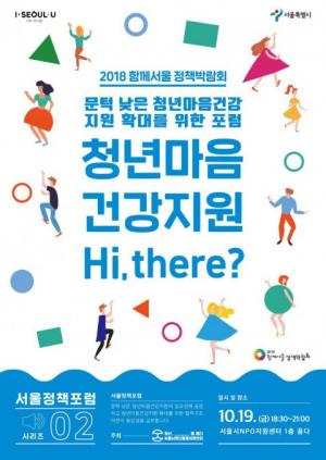 서울시청년활동지원센터는 오는 19일 NPO지원센터 1층 대강당(품다)에서 문턱 낮은 청년마음건강 지원 확대를 위한 포럼 '청년마음건강지원 Hi, there?'을 개최한다고 밝혔다.문턱 낮은 청년마음건강 지원 확대를 위한 포럼인 '청년마음건강지원 Hi, there?'는 2018 함께서울정책박람회의 일환으로 서울시청년활동지원센터에서 주최하는 행사이다. 청년마음건강지원에 관심있는 누구라도 참석이 가능하다. 이번 포럼에서는 서울시청년활동지원센터 마음건강지원사업의 현황, 온라인 고민상담소 '마음톡톡'