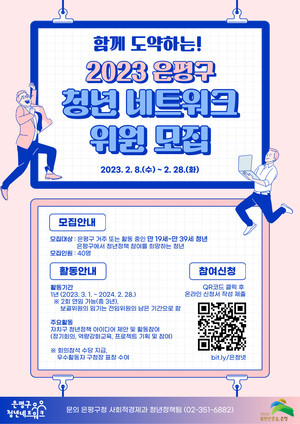 서울시 은평구가 청년의 다양한 욕구를 반영한 청년 정책을 실현하기 위한 '은평구 청년네트워크 제7기 위원'을 모집한다.청년네트워크 위원은 청년 정책 발굴과 개선 방향 제시 등 실천적 과제를 도출해 구의 청년 정책에 반영하는 중요한 역할을 맡는다. 은평에서 활동하는 청년(만 19세 이상 만 39세 이하)을 대상으로 모집하며 임기는 1년이다.주요 활동은 매월 정기회의에 참석하고 청년일자리, 주거, 문화·체육, 교육 등 다양한 분야의 분과를 구성하여 청년 정책을 모니터링 및 제안하는 활동을 한다. 청년 간 커뮤니티 형성, 정보 교류, 소