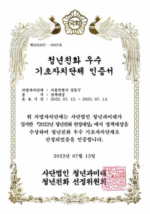 서울 강동구가 '2022 청년친화헌정대상'에서 '정책 대상'을 수상하며 4년 연속 수상의 쾌거를 이뤘다.2019년 '소통 대상'에 이어 2020년과 2021년은 연이어 '종합 대상'을 수상했다. 또 올해는 '정책 대상'을 수상함으로써 또 다시 청년정책 우수 기초자치단체로 선정된 것이다.'청년친화헌정대상'은 국회사무처 소관 (사)청년과미래가 '청년 친화적 환경조성'에 기여한 기관들의 업적과 공로를 격려하기 위해 주관하는 것으로 2018년에 시작되어 올해로 5회째를 맞이했다. 대학교수, CEO, 변호사, 언론인 등 전문가를 포함한 청년