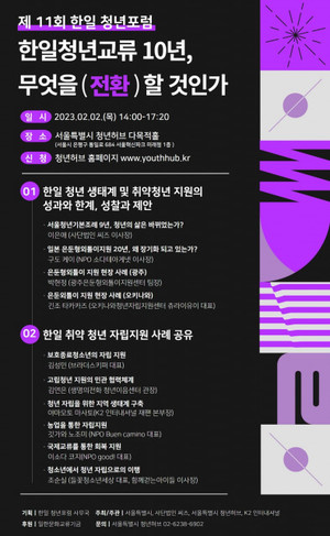 사단법인 씨즈(이하 씨즈)는 2일 서울특별시 청년허브 다목적홀에서 제11회 한일청년포럼 '한일청년교류 10년, 무엇을 전환할 것인가'를 개최한다.해당 포럼은 한일 양국의 은둔형외톨이, 고립청년, 니트, 보호종료청년 등 취약계층 청년 지원 전문가 10명이 모여 청년 생태계 및 취약청년 지원의 현장 사례를 발표하고 한일 미래 청년정책 방향을 모색하는 자리다.이번 포럼에 앞서 씨즈는 2022년 제10회 한일청년포럼을 통해 팬데믹 이후 고립청년을 위한 지원정책과 방법론을 이야기한 바 있다. 해당 포럼에서는 서울시 고립·은둔청년 지원사업 추