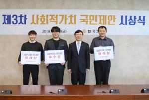 한국감정원은 지난 10일 대구에 위치한 한국감정원 본사에서 '제3차 사회적가치 국민제안' 시상식을 개최했다. 지난해 12월 26일부터 올해 2월 28일까지 실시된 공모전을 통해 접수된 113건에 대해 내부심사와 'KAB 시민참여단' 등 외부심사를 거쳐 '재개발・재건축 관련 정보시스템 구축을 통한 사회적가치 실현' 제안을 포함해 우수상 2건, 장려상 2건을 선정했다. 수상자에게는 상금(우수상 각 100만원, 장려상 각 50만원) 및 채용시 가점을 부여하고, 우수작으로 선정된 제안
