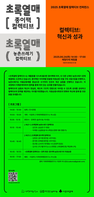 재단법인 숲과나눔과 사회복지공동모금회 사랑의열매는 오는 24일 오후 3시, 서울 중구 페럼타워 페럼홀에서 '2025 초록열매 컬렉티브 컨퍼런스 '를 개최한다고 밝혔다.이번 컨퍼런스는 시민 주도의 자원순환 플랫폼 '초록열매 컬렉티브'의 실험과 성과를 공유하고, 향후 과제와 정책 제안 등을 논의하기 위해 마련됐다.'초록열매 컬렉티브'는 지난 2023년 가을 출범한 시민 주도형 프로젝트로, 종이팩과 농촌쓰레기 자원순환 체계를 개선하기 위한 다양한 실험을 진행해왔다. 참여 단체로는 삼삼은구, 싱글벙글_비니루없는점빵