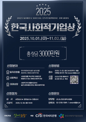 (사)한국마이크로크레디트 신나는조합과 ㈜한국씨티은행이 '2025 한국사회적기업상' 수상기업을 모집한다. 이번 상은 취약계층 일자리 창출, 사회서비스 제공, 다양한 사회문제 해결을 위해 노력해 온 (예비)사회적기업을 격려하고, 우수 사례를 널리 알리기 위해 마련됐다.모집 대상은 전국의 (예비)사회적기업으로, 기존 수상 기업은 참여할 수 없다. 시상 분야는 △일자리창출 △사회혁신 △미래성장 3개 부문이며, 각 부문별 1개 기업이 선정된다. 수상 기업에는 각 1,000만원의 상금이 주어진다. 심사는 서류심사, 현장실사, 발표심사 순으로