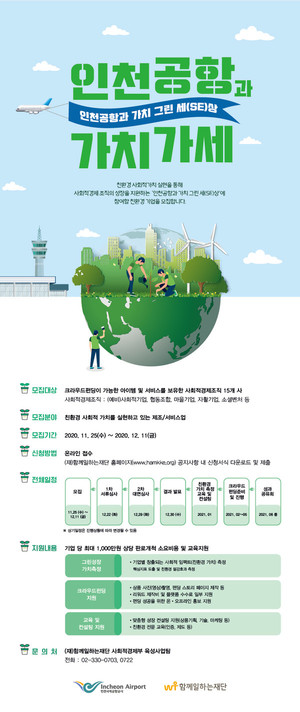 함께일하는재단은 인천국제공항공사와 손잡고 친환경 사회적경제조직의 성장을 지원하는 '인천공항과 가치그린 세상'을 진행한다.이 사업은 친환경 사회적 가치를 실현하고 있는 제조 및 서비스업 분야 사회적경제조직을 지원하기 위해 기획됐다. 크라우드펀딩이 가능한 아이템 및 서비스를 보유한 사회적경제조직 15개사를 모집한다.사업에 선발된 기업에는 기업당 최대 1000만 원 상당의 판로개척 비용 및 교육 프로그램이 제공된다. 세부 지원내용으로는 ▲크라우드펀딩 지원 ▲친환경 교육 및 컨설팅 지원 ▲그린성장 가치측정 등