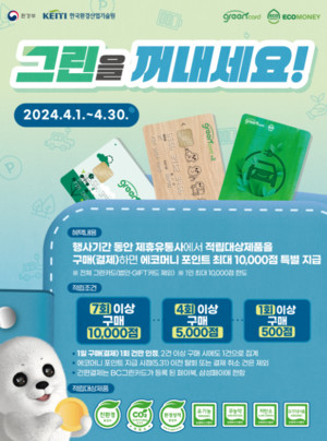 환경부 산하 한국환경산업기술원은 4월 22일 지구의 날을 맞아 1일부터 30일까지 녹색소비생활 확산을 위한 '그린을 꺼내세요' 행사를 진행한다.그린카드는 소비자가 녹색소비생활을 실천할 때마다 현금처럼 쓸 수 있는 보상 혜택으로 '에코머니 포인트'를 제공한다.이 기간에 그린카드로 제휴유통사에서 녹색제품 등 적립대상제품(환경표지 인증 제품, 환경표지 인증 제품, 저탄소제품, 환경성적표지 인증 제품, 저탄소 인증 농산물, 친환경 인증 농산물)을 구매하면 최대 10,000점을 특별 적립(총 구매 1~3건 500점, 4~6건 5,000점,