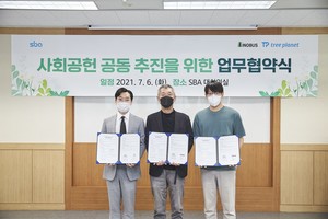 서울산업진흥원(SBA)이 친환경 비즈니스를 실천하는 소셜벤처 기업 ㈜트리플래닛, 이노버스와 함께 ESG(Environment, Social, Governance) 사회공헌 프로젝트를 시작한다.㈜트리플래닛과는 플라스틱 쓰레기를 재활용해 만든 '스밈화분'을 SBA 임직원이 직접 키우고 이를 지역사회 소외계층에 기부하는 방식의 '반려나무 입양사업'을 한다. 이노버스와는 친환경 IoT 컵 수거함 '쓰샘'을 활용해 직원들의 일상 속 분리배출 활동 동참을 유도한다.이와 관련해 SBA은 지난 6일 ㈜트리플래닛, 이노버스와 ESG사회공헌 'Gre