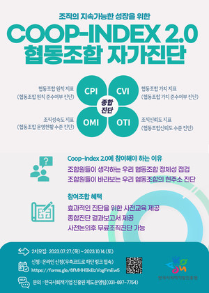 한국사회적기업진흥원에서 2019년 처음 도입한 쿱인덱스 2.0은 협동조합 경영 진단, 성과 평가 도구이다. 이후 통계적 오류나 미비점을 개선하는 작업을 거쳐 지난해 성과공유회를 개최했다. 올해는 편의성을 더해 온라인 설문 시스템을 갖춰 '2023년 쿱인덱스 2.0 지원사업'을 진행한다. 새롭게 진행되는 쿱인덱스 2.0의 특징으로, 자가 진단으로 인한 답변의 편향성을 개선하기 위해 점수에 따른 인센티브보다는 문제 발견과 해결 역량을 키울 수 있는 교육 지원 방안에 집중했다. 쿱인덱스 2.0 개발에 참여하고 사업을 수행하는 성공회대학교
