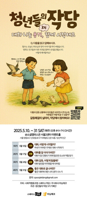 사회적협동조합 스페이스 작당이 주식회사 미닝에코와 함께 '청년들의 작당' 3기 참가자를 오는 20일까지 모집한다.'청년들의 작당(이하 작당)'은 서로 다른 생각을 가진 청년들이 모여 다양한 사회 문제에 대한 생각과 이야기를 나누고 행동하기 위해 마련된 프로그램이다.내달 10일부터 4회에 걸쳐 진행되는 프로그램은 ▲대화, 어떻게 시작할까? ▲대화를 잘 이어가려면? ▲대화 갈등, 어떻게 탈출해? ▲좋은 대화로 끝나려면? 등 '대화'에 초점을 맞춰 진행된다. 참여자는 다양한 형태의 대화 실험을 통해 건강한 갈등이 가능하기 위해 무엇이 필