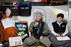 “울어도 돼요.”“울면 계속 눈물 나잖아.”반올림 공유정옥 활동가가 크레파스로 피켓에 쓸 글씨를 쓰면서 김시녀씨(삼성직업병피해자 한혜경씨 어머니)에게 말한다. 김시녀씨는 피켓에 비닐을 붙인 후 연신 걸레로 방바닥을 훔친다. 선반 위 생수가 얼어있다. 어떤 날은 보온병에 든 커피도 언다고 한다. “저녁은 그냥 여기서 먹어요. 누구 한 명 지키라 하기도 뭐하고.”“뭐 먹을까? 여기서 시켜먹은 것 중 제일 비싼 게 탕수육인데.”“팔보채 뭐 이런 거 먹어볼까요?”“그 겨자 들어간 거 있잖아.”“아. 양장피. 유산슬도 시키고.