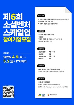 한국사회혁신금융 주식회사와 서울시 성동구가 유망 소셜벤처 및 사회적기업의 성장을 지원하는 '소셜벤처 스케일업(Scale-up) 프로그램'의 참여기업을 모집한다.올해 6회차를 맞이하는 본 사업은 성동구에 소재한 창업 7년 이내의 소셜벤처 및 사회적기업 중 투자유치를 희망하는 기업을 대상으로 한다. 서면 및 대면 평가를 거쳐 최종 3개 기업을 선발한다. 선정된 기업에는 △기업진단 △IR컨설팅 △데모데이 △VC미팅데이 등 기업 맞춤형 액셀러레이팅 프로그램을 제공한다. 모집은 5월 2일까지며, 신청은 QR코드를 통해 구글 폼을 작성해 제출