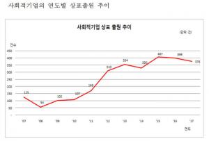 사회적 이익을 우선시하는 사회적기업에 대한 중요성이 부각됨에 따라 이들 기업들의 상표출원도 크게 증가 중인 것으로 나타났다.7일 특허청에 따르면 지난 2007년 사회적기업 인증제도 시행 이후 올 상반기까지 사회적기업들의 상표출원 건수는 모두 2889건에 이른다. 인증 초기인 2007년부터 2011년까지는 해마다 100여건에 머물다 2012년부터는 연평균 300여건씩 쏟아져 2017년에는 376건, 올해 6월까지도 156건이 나왔다.주요 상품(업종)별 출원현황에서는 도소매업이 349건(12.08%), 교육·지도·문화활동업 258건(8