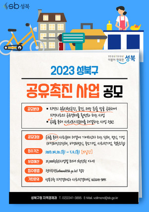 서울시 성북구가 공유를 통해 사회문제 해결에 기여하고자 하는 단체, 법인, 기업을 모집하고 지역 내 유휴자원 발굴에 나선다.성북구는 다양한 지역 자원을 공유해 사회적 가치를 창출할 수 있는 '2023 성북구 공유촉진 사업'을 공모한다고 24일 밝혔다. 공유촉진 사업은 지역의 유휴 공간, 주민의 물건, 재능, 경험 등 지역자원의 공유를 통해 사회적 가치를 창출하고 지역사회 공유경제를 활성화하는 사업이다.2022년에는 5개 단체가 사업에 참여했다. 수어 영상을 관내 문화시설 등에 배급해 청년 예술가와 어르신이 함께하는 예술 체험활동을