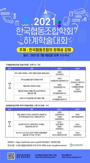 한국협동조합학회는 9일 '한국협동조합의 정체성 강화'를 주제로 2021년도 하계학술대회를 개최한다. 우선 장승권 한국협동조합학회장이 좌장으로 참여하는 주제발표세션에서는 ▲한국 신협의 변화하는 사회적 역할과 정체성 재정립 방향 ▲한국농업협동조합의 정체성과 미래 ▲협동조합의 정체성과 한살림 ▲협동조합 정체성 강화를 위한 농촌지역에서의 협동조합 역할 ▲사회의 지속가능발전을 위한 생협의 역할이란 제목으로 장종익(한신대학교), 유형석(농협중앙회 농협경제연구소), 임채도(모심과살림연구소), 김종한(한국협동조합연구소), 최은주(아이쿱협동조합연구